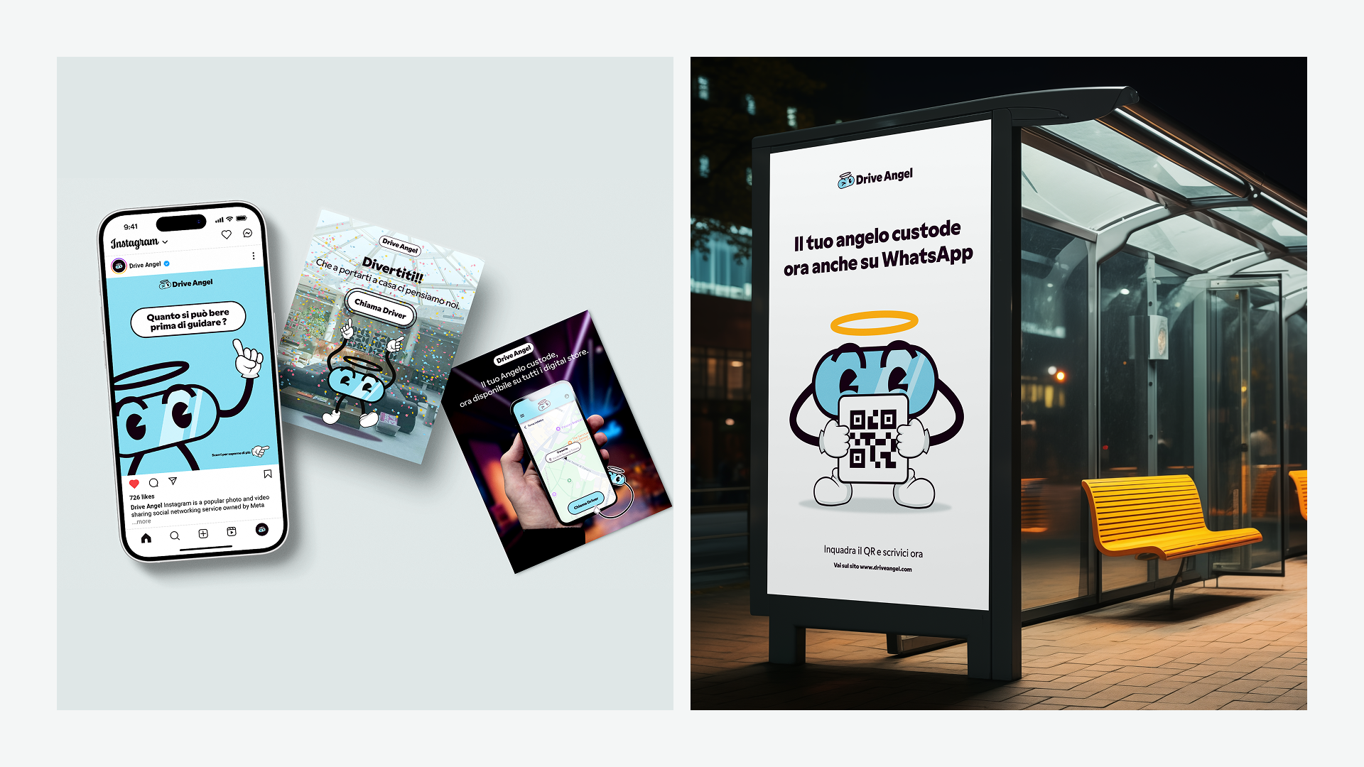 The result is a coherent visual communication strategy able to speak to diverse audiences—from young people heading out at night to anyone who wants to feel safer behind the wheel. Today, Drive Angel presents itself as a smart, reassuring, and memorable service, with a strong identity that stands out even among more traditional competitors.